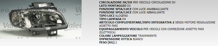 PROIETTORE ANTERIORE DESTRO VALEO COD. 87585